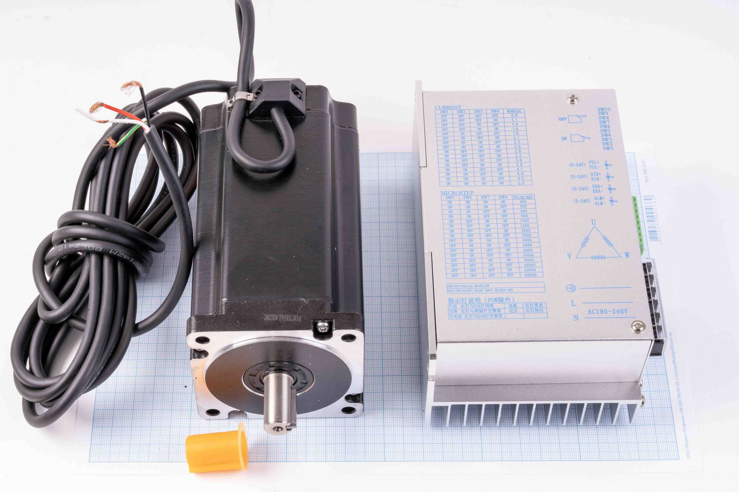 Драйвер працює від мережі AC 180–240 V, підтримує двигуни з робочим струмом до 5.0 A і зовнішнім діаметром 86-110 мм. Висока точність позиціонування досягає 60 000 кроків/оберт, що дозволяє використовувати пристрій у середніх і великих системах з високими вимогами до роздільної здатності.