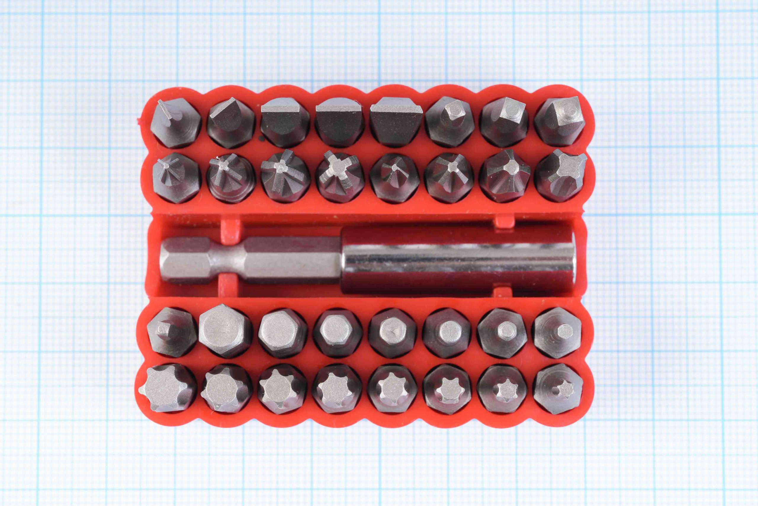 - Універсальність: у комплект входять біти найпопулярніших типів — Torx, хрестові, шліцьові, шестигранні, PZ та інші.