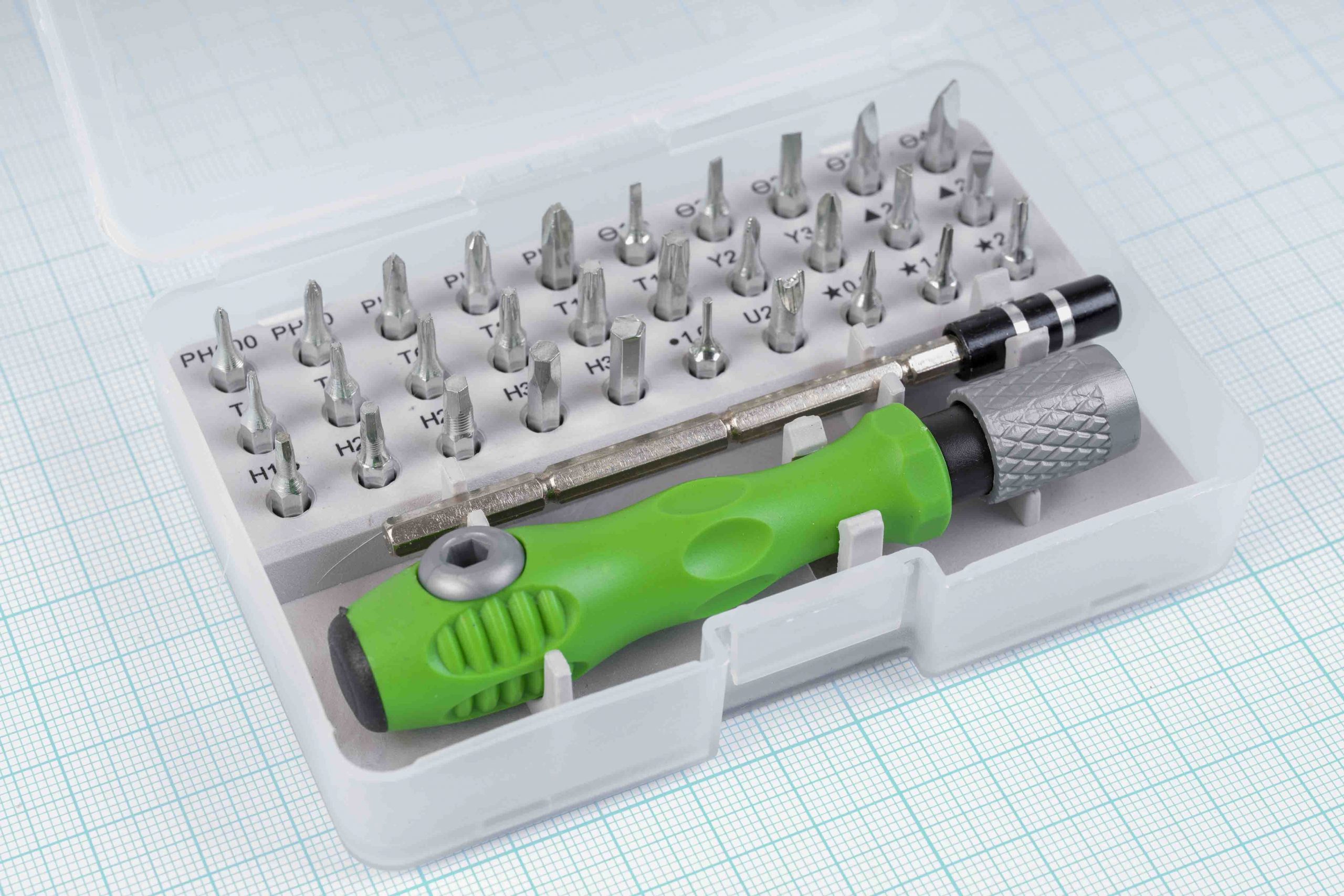 - Прецизійна викрутка: Викрутка виготовлена з пластику, що забезпечує легкість та міцність конструкції. Ергономічна рукоятка з антиковзким покриттям гарантує комфорт у роботі навіть при тривалому використанні.